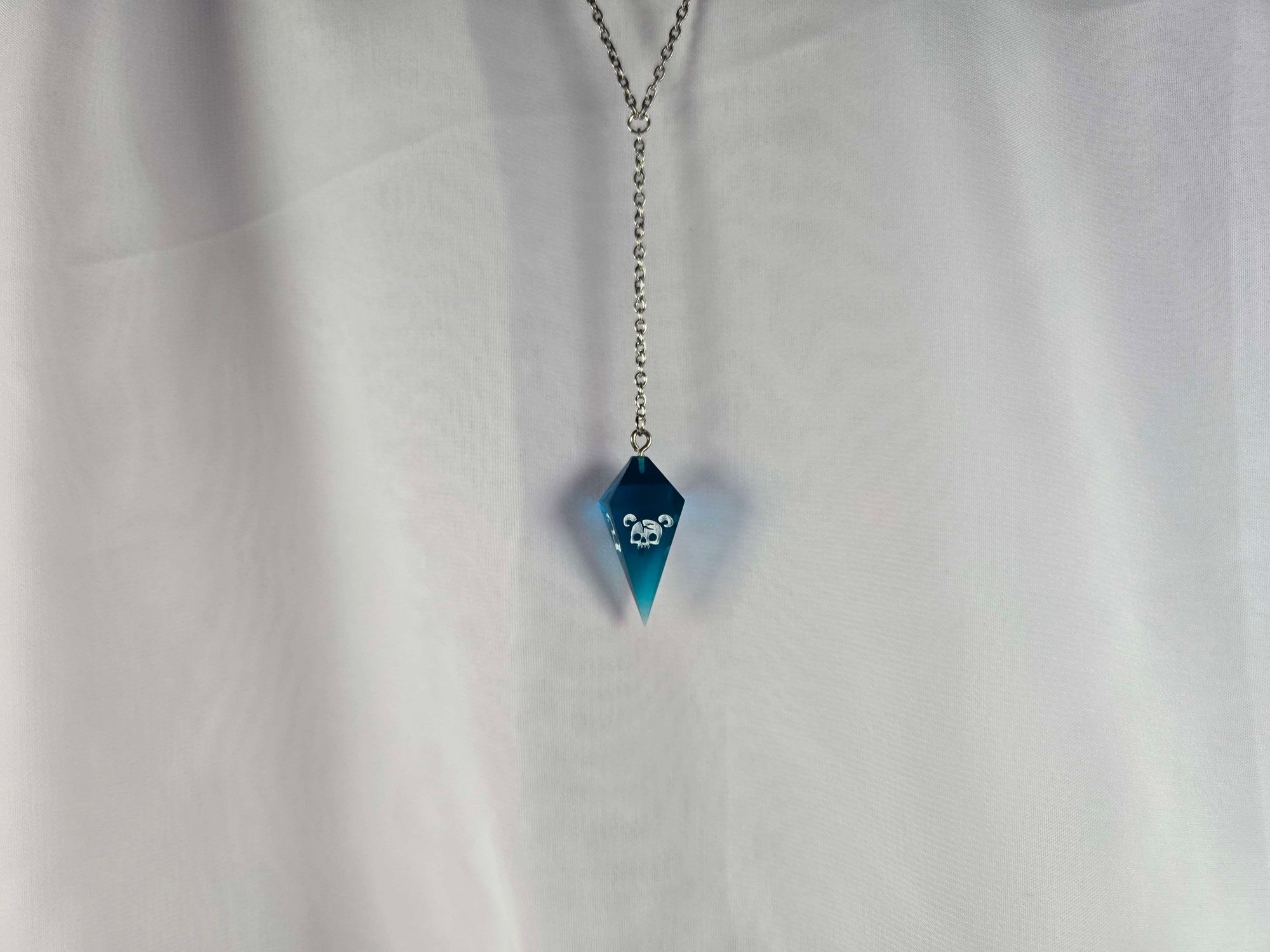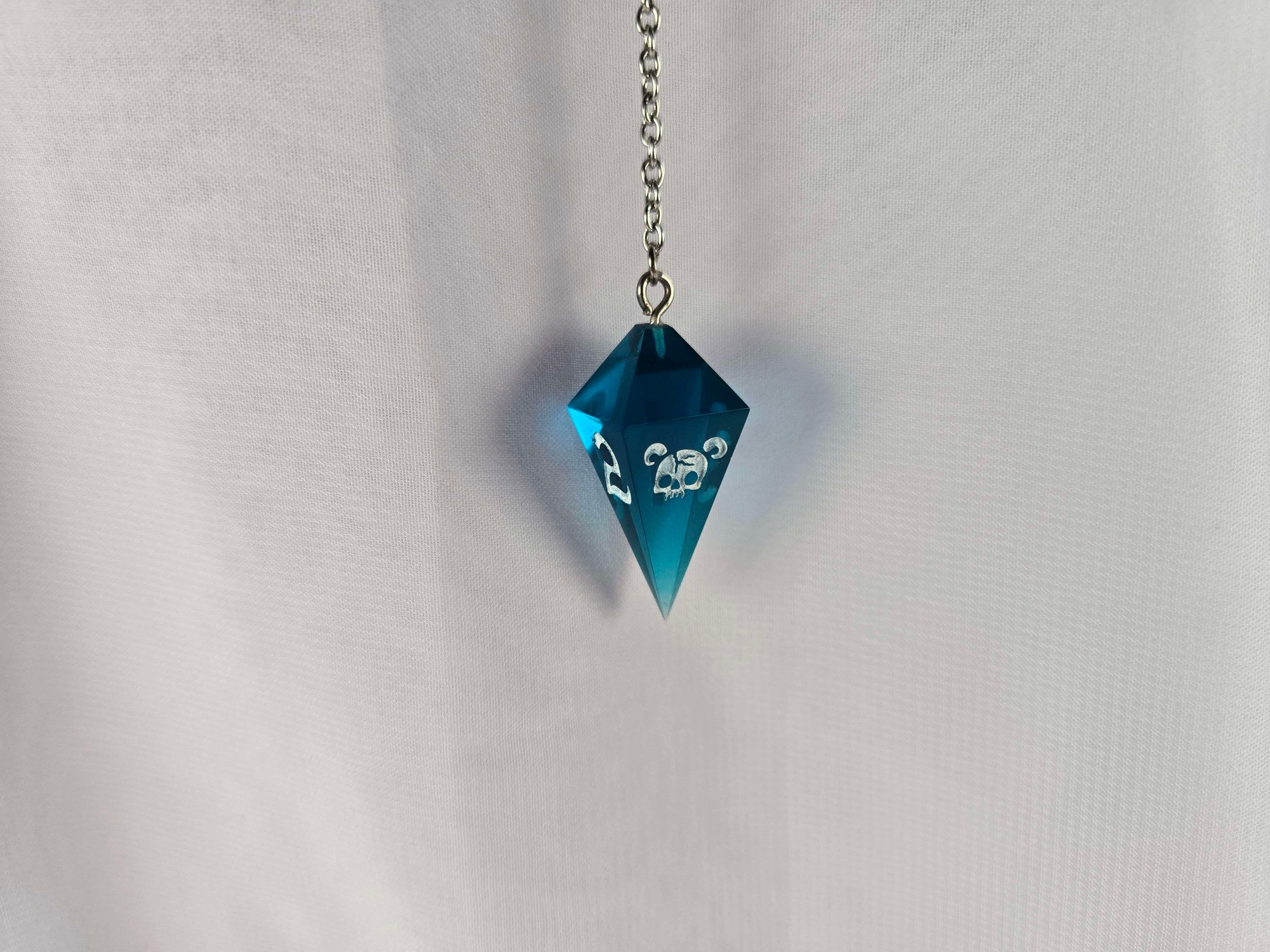 A translucent blue D4, with silver numbers, on a silver plated Y chain necklace, and a floral filigree connector. 18" chain, 3.5" drop