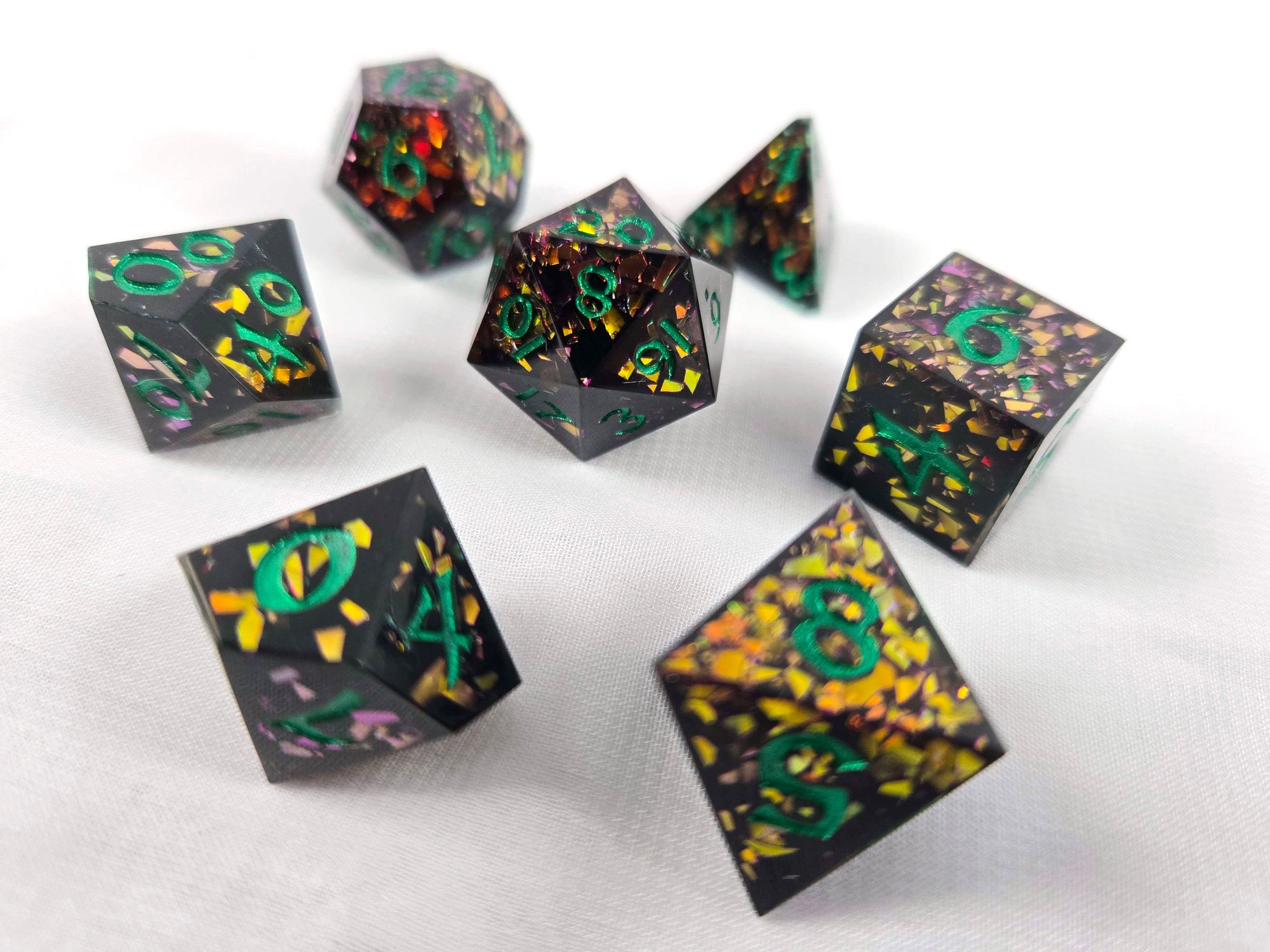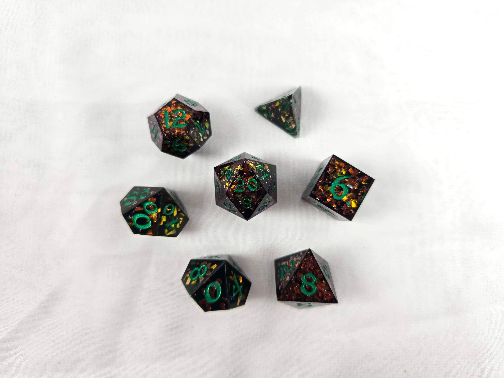 A black resin core with color shifting gold/orange/red/purple flakes and finished with green metallic numbers. Featuring our signature font and the sharp edge look this set has the standard 7 dice, everything a growing dice goblin needs.