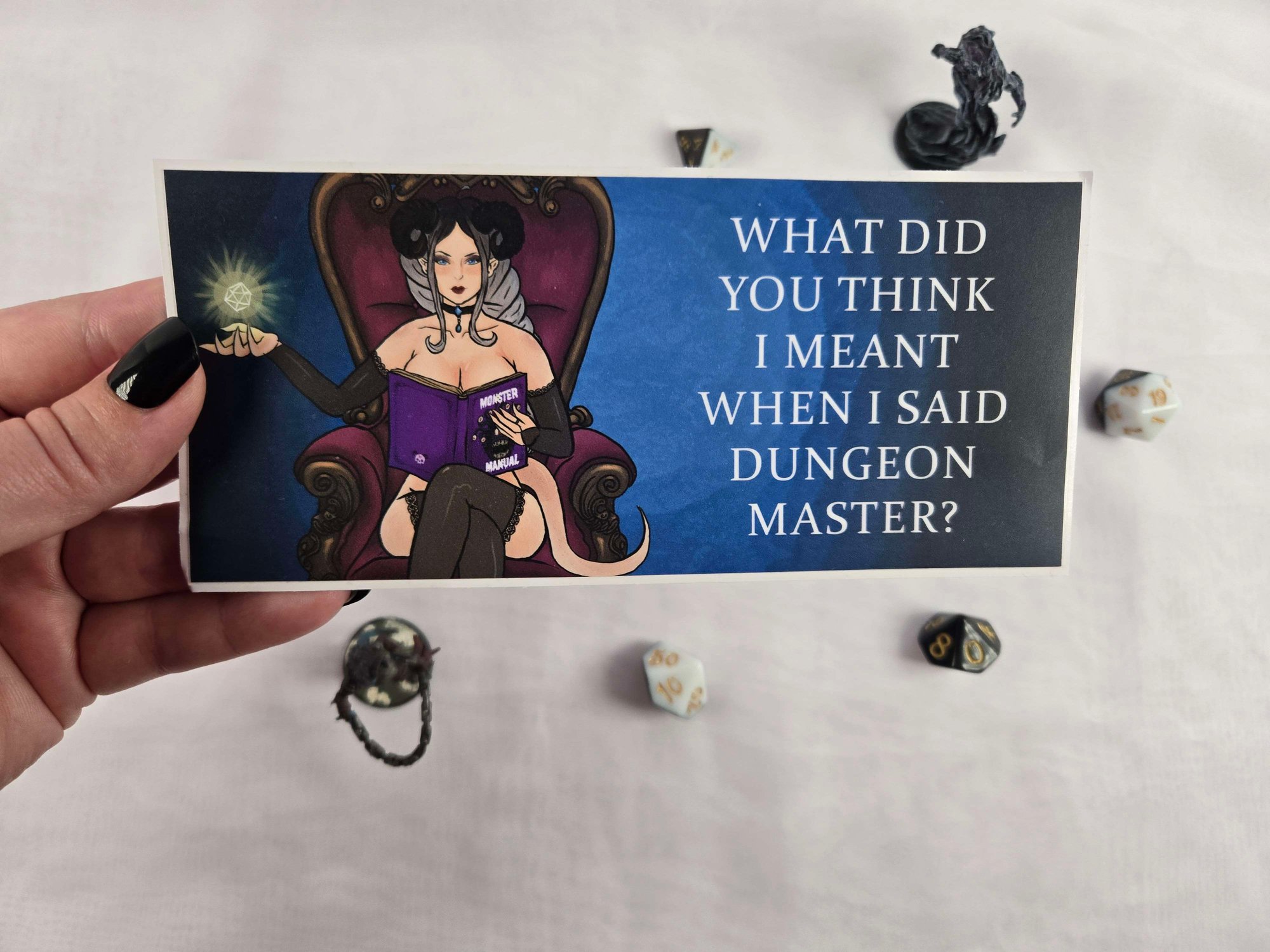 Our suggestive DM slap sticker asks a very important question, What did you think I meant when I said Dungeon Master? Perfect for all those sexy DMs out there. Weatherproof and fade resistant, ~3"x7" waterproof vinyl, matte finish.