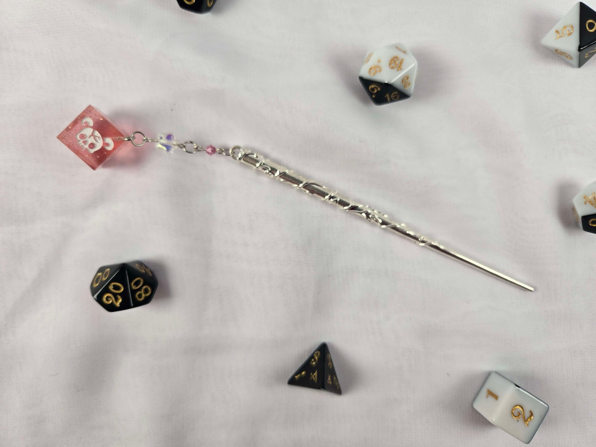 Sharp edge handmade dice, all on a 5" long antique brass or silver hair stick with a winding vine design.