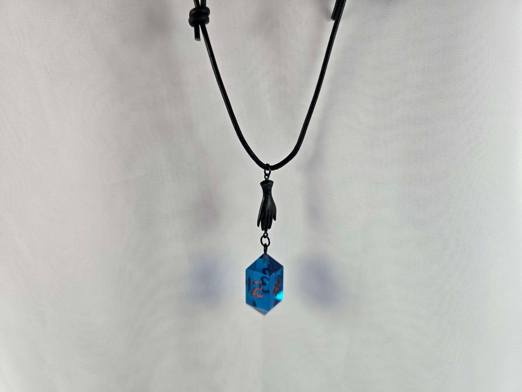 A Black hand accents this translucent blue D4, with brass numbers, on an adjustable black leather cord necklace. Length max 30", and a min of 16"