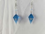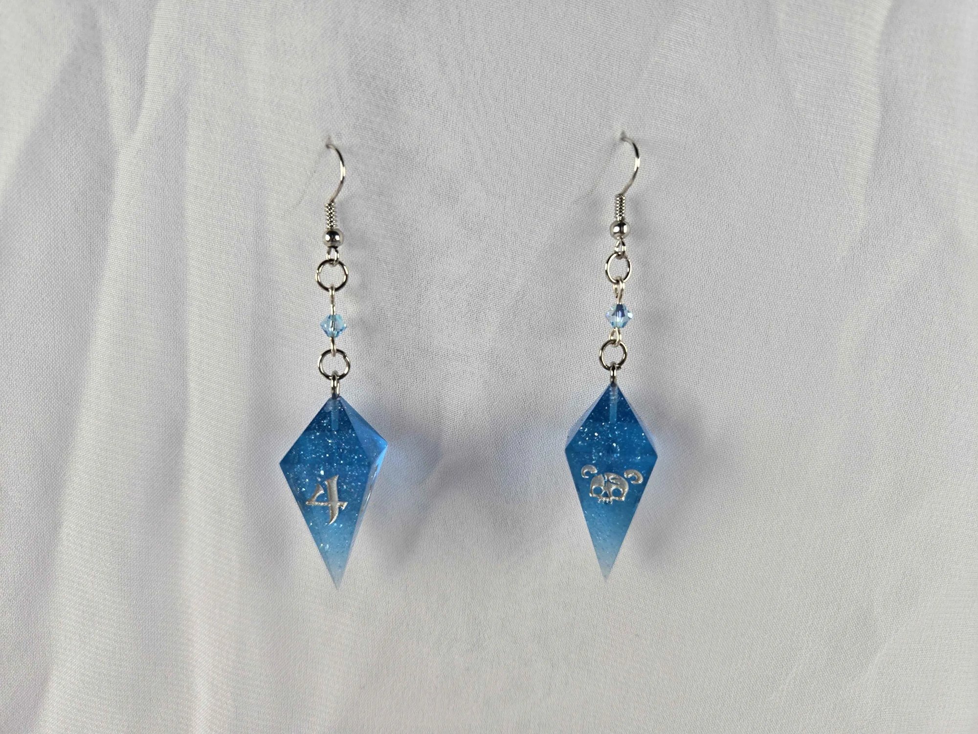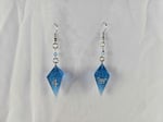 Featuring crystal D4s with translucent blue resin, rainbow holographic glitter, and silver numbers, accented with a swarovski crystal. On surgical steel ear hooks.